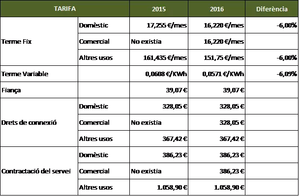 Aquestes noves tarifes pel 2016  representen una reducció del 6,00 % en el Terme Fix i del 6,09 % en el Terme Variable, respecte de les de l’any 2015.